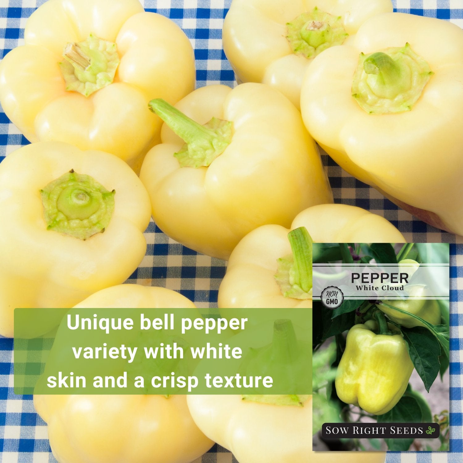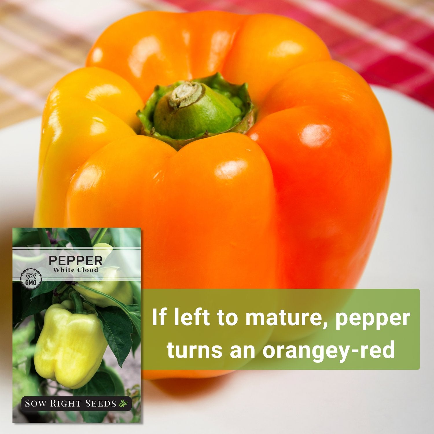 Unique white bell pepper with pale ivory skin and crisp flesh. If left to fully mature, peppers will ripen to a red-orange. 70 days to maturity.