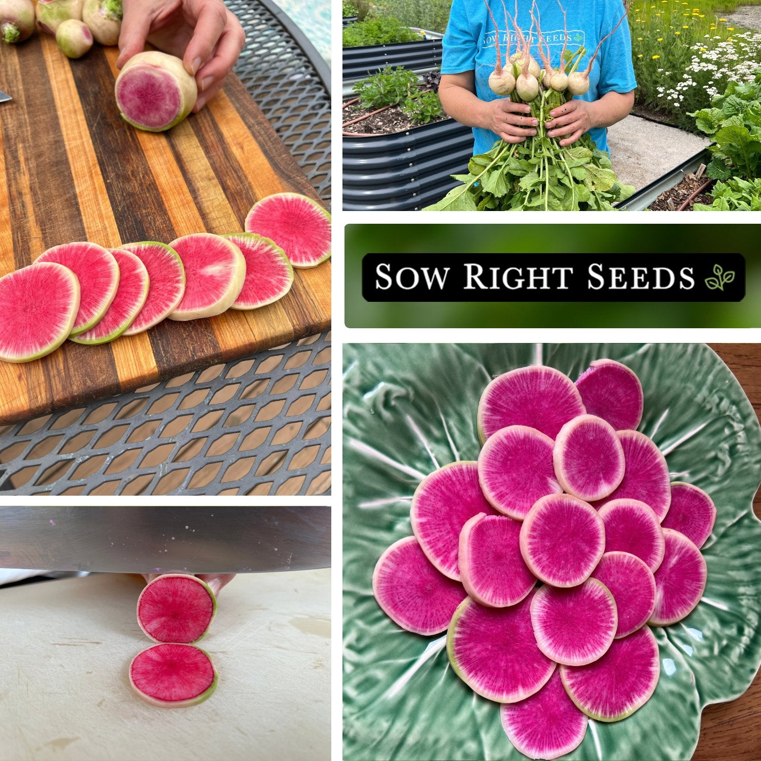 Watermelon Radish (Raphanus sativus) is an heirloom Daikon radish from China with a white exterior. When sliced, this radish looks like a small slice of watermelon, with a green and white edge surrounding a rosy center. Standard seed packet contains 3 g (about 280 seeds). Jumbo packet contains 10 g (about 950 seeds).