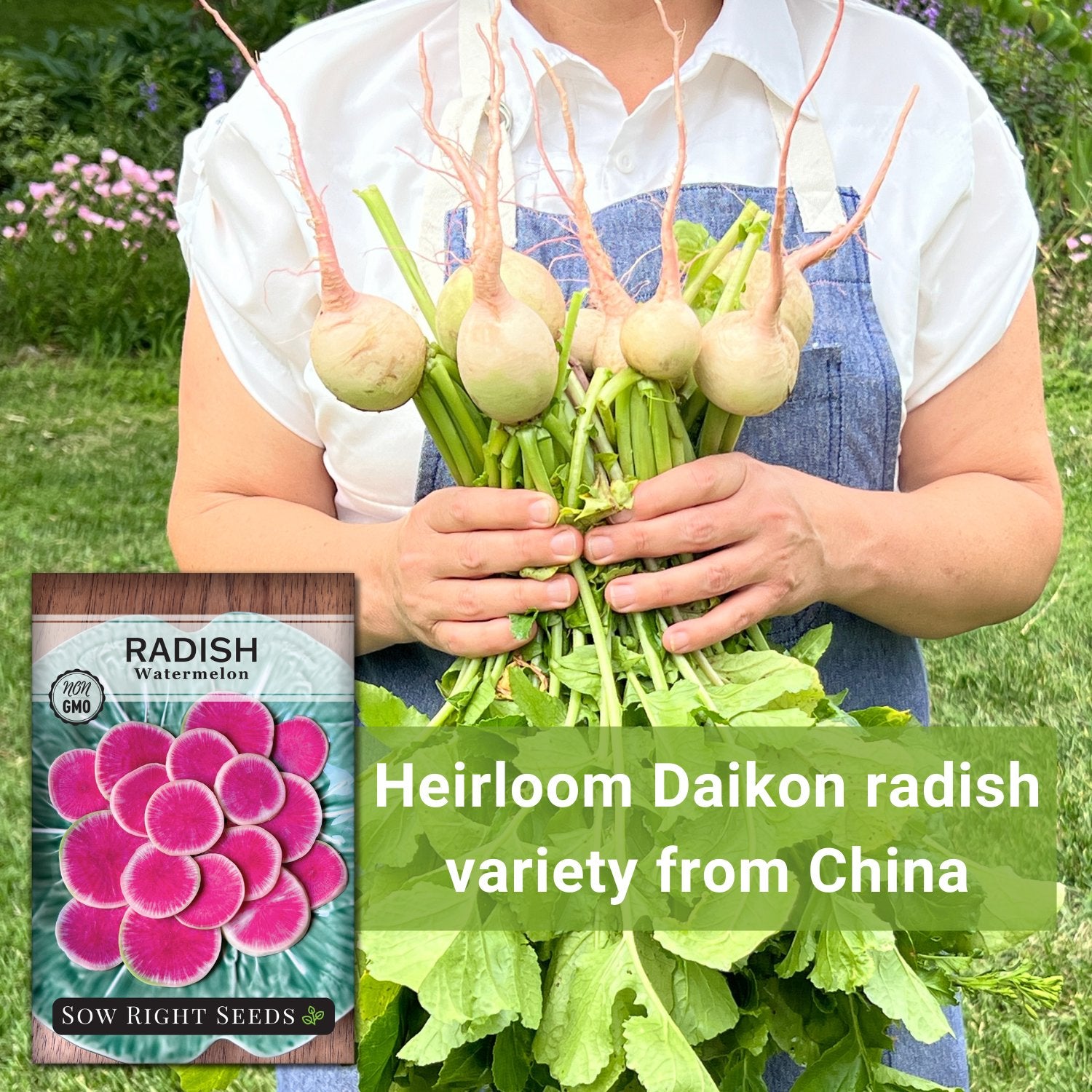Sow outdoors in a sunny spot with loose, well-drained soil. Water continuously and evenly. Best planted in late summer or fall; will bolt in hot weather. Harvest at 3" or smaller; watermelon radish becomes woodier at larger sizes.