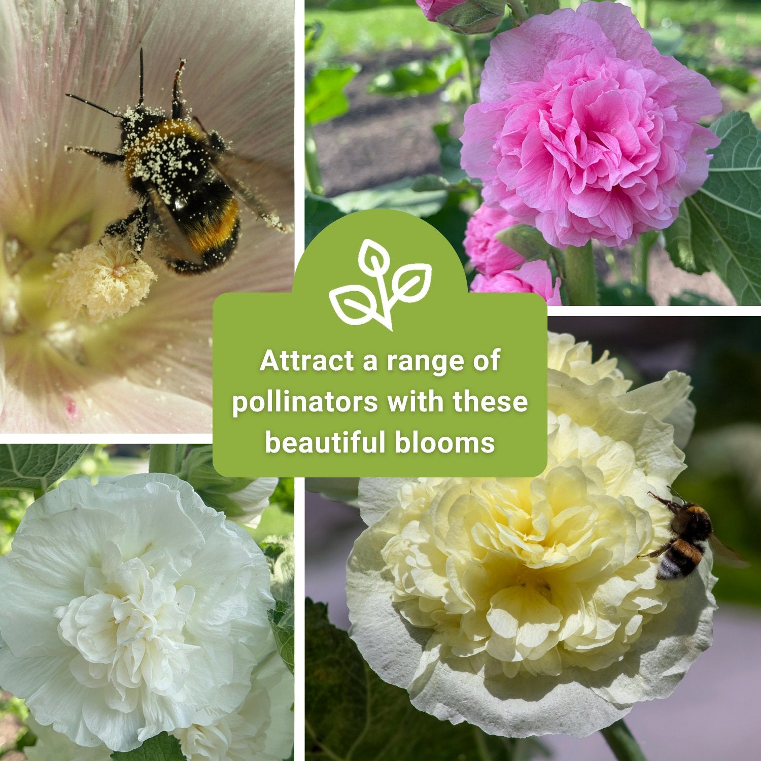This variety of Hollyhock is a classic cottage garden favorite, featuring tall spikes of fully double, ruffled blooms in a range of colors. Hollyhock plants, which can reach 6', are perfect for adding vertical interest and old-fashioned charm to garden borders and beds.