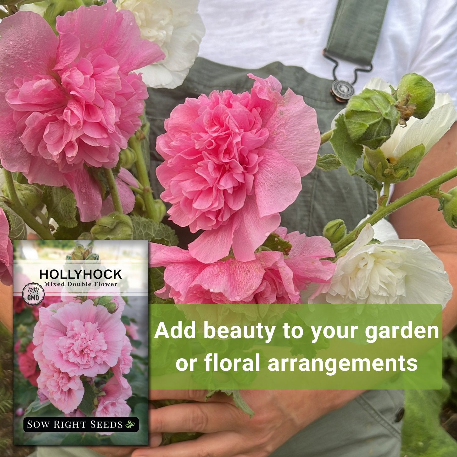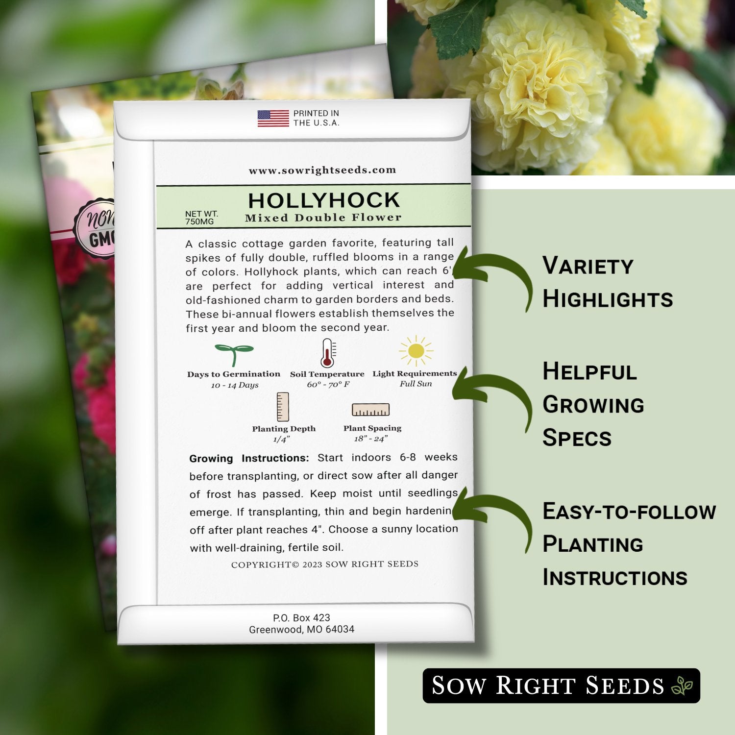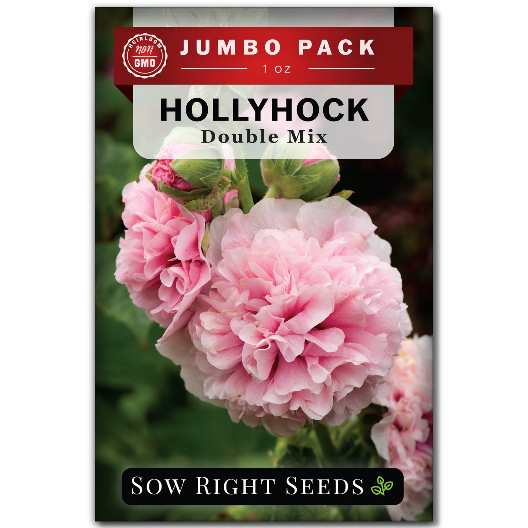 Standard packet contains 750mg (about 80 seeds). Jumbo packet contains 1 oz (about 2800 seeds). Start Hollyhock seeds indoors for early blooms - Large, premium seed packets give instructions on how to grow and when to plant outdoors.